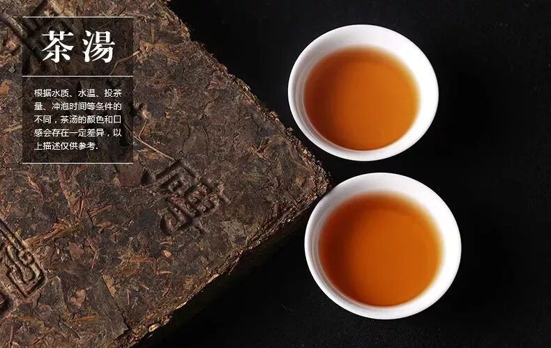 磚面平整,棱角分明,色澤黑褐,香氣純正,帶松煙香,湯色黃琥珀色,滋味醇和,微澀,略帶梅子味,陳茶轉(zhuǎn)化為樟香味。