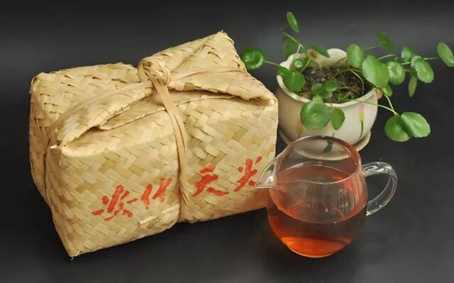 棒型,花格篾簍包裝,茶葉緊實,色澤黑褐,內(nèi)質(zhì)香氣純正,略帶松煙香,湯色黃琥珀色,明亮有活性,滋味醇和,微澀。