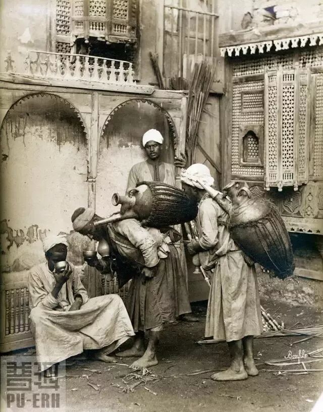 一些老照片,記錄了摩洛哥人沿街叫賣茶水。背水的器物,有牛皮囊、陶罐,據(jù)說還有瓷罐玻璃罐。(1891年攝)