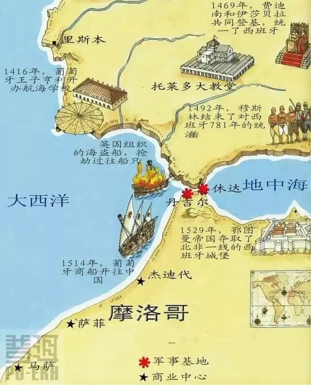 16世紀上半葉,葡萄牙商人到達澳門,開始向西方販運絲綢、瓷器和茶葉。葡萄牙城堡、據(jù)點和商站遍布東非、南非和西非海岸線。為與東方貿(mào)易配套,葡萄牙在摩洛哥的馬薩(MASSA)、薩菲(SAFI)和杰迪代(EL JADIDA)三地設有商貿(mào)中心。戰(zhàn)略要地直布羅陀海峽附近的丹吉爾卻只有城堡等軍事設施。我沿葡萄牙南海岸線從阿亞蒙特到薩格里拉走了一圈,在拉古什找到了伽馬的雕像、奴隸拍賣市場和幾個形制經(jīng)非洲海岸線一路延伸到亞洲的城堡。