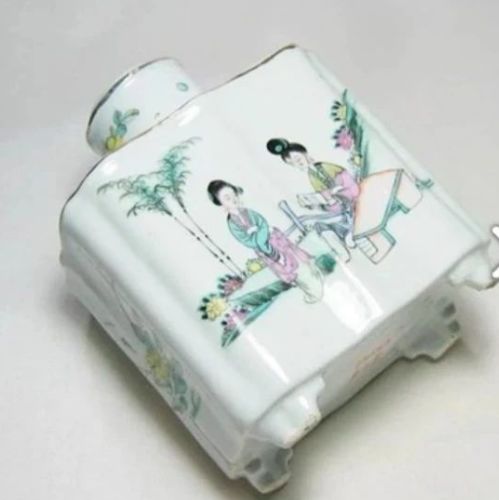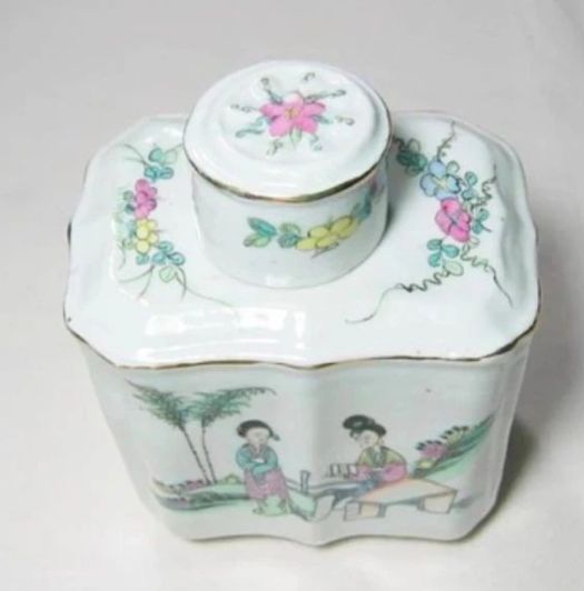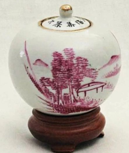 下圖胭脂茶罐,白底紫嫣紅,彩繪山野扁舟圖。構(gòu)圖為遠(yuǎn)山、樹(shù)林、茅屋及一葉扁舟。凈重約1盎司(28.375公克),故此小巧的茶罐所盛裝的茶葉量不大。茶罐造型精美,內(nèi)置歐美人士向來(lái)所喜的香花茶,故推測(cè)應(yīng)是當(dāng)年外銷(xiāo)的高級(jí)茶款。