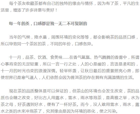 普洱茶界有句比較經(jīng)典的話語:“品老茶,喝熟茶,存新茶”。每一年為自己存一點喜歡的茶,想喝好茶的時候,隨時都有好茶可以喝。